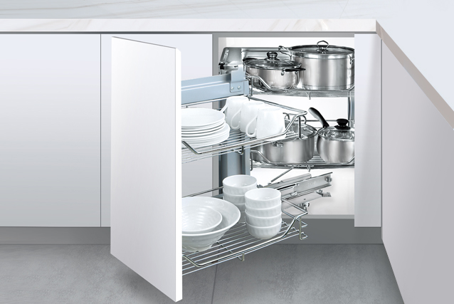 → 功效:充分使用转角位置空间, ,,,,,,一次性把转角篮的所有物品带到柜门外, ,,,,,,物品存取更便捷。。。。 。。